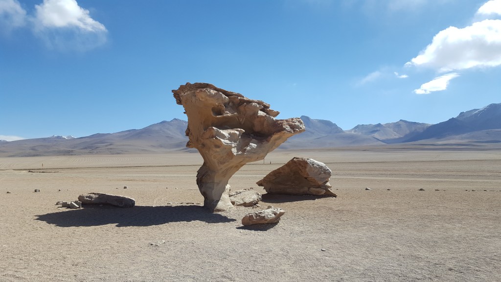 Depois do almoço, fomos para o Desierto Siloli, onde pudemos ver o famoso Arbol de Piedra, pedra em forma de árvore. Há no local outras pedras para subir e apreciar a vista.