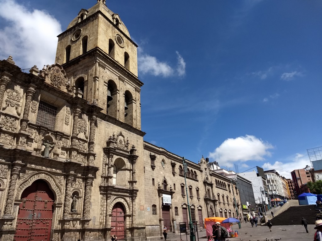 La Paz – Tomamos café no The Writers Coffee, visitamos o entorno da Plaza Murillo, e entramos na Catedral de La Paz. Depois disso, tentamos ir no Museu de Arte ao lado, mas estava fechado (fecha 12-15h), então passamos pelo Teatro Municipal (que não vale muito a pena, na minha opinião) e terminamos a caminhada na bela Calle Jean. Aproveitamos e já fechamos passeio do próximo dia na Hanaq Pacha Travel.