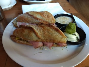 O menu de café da manhã tinha opções de sanduíches deliciosos, com diferentes embutidos e molhos exóticos. Vale provar!