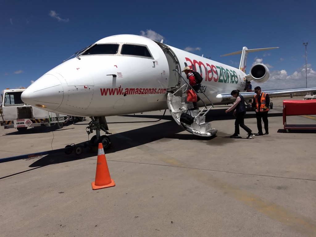 - Ir de avião pela Amaszonas ou Boliviana, que é a opção mais cara – uns 300 reais, mas mais confortável. Fomos com a Amaszonas e foi um bom vôo. O avião é menor, semelhante aos da Azul, com duas cadeiras em cada lado, mas a viagem foi bem tranquila e durou apenas 1h.