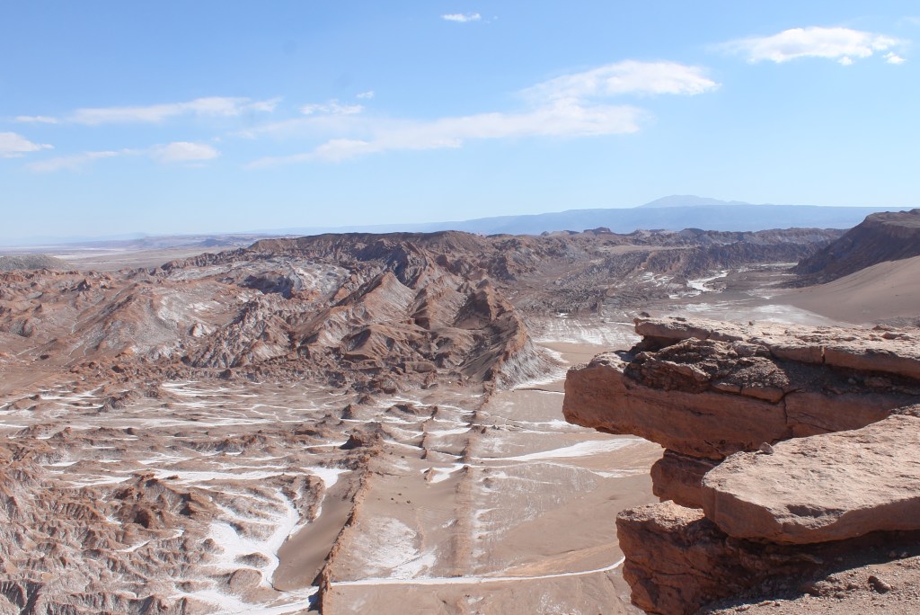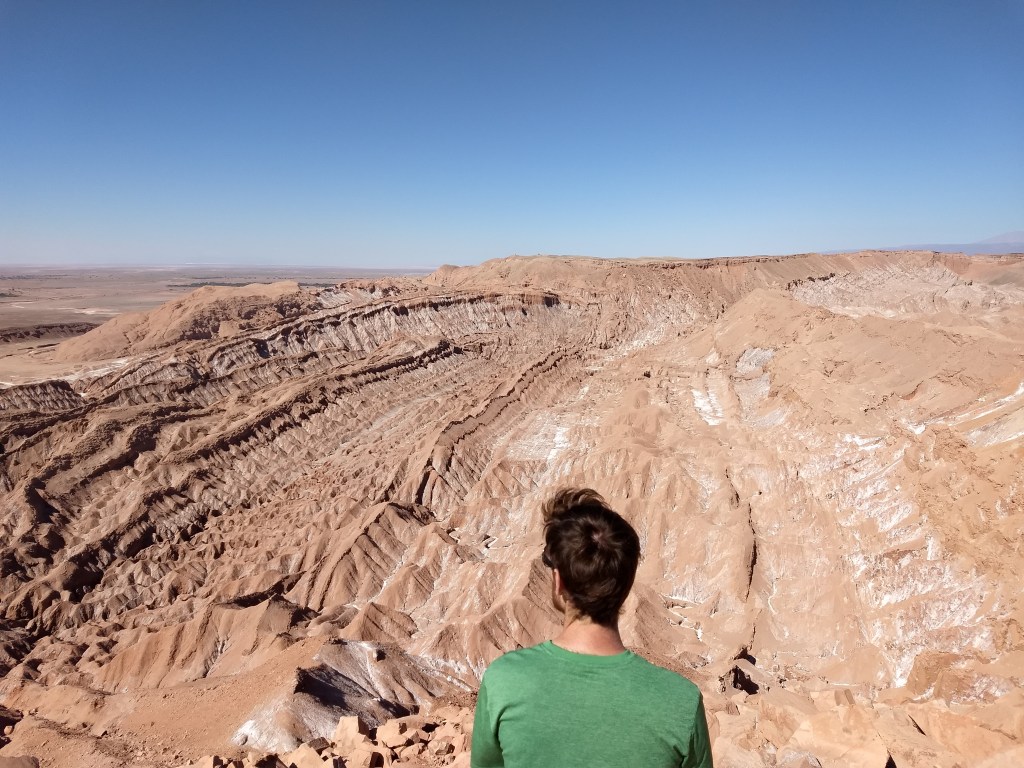 San Pedro de Atacama – Depois dos dias intensos na Bolívia, fizemos um roteiro mais tranquilo no Atacama. Nesse primeiro dia fomos à tarde no Valle de La Luna, que passa pelas belas formações rochosas locais e conta com o contraste entre a terra, o céu azul e o sal. O passeio termina apreciando o pôr do sol de um ponto especial e que é possível ver desde os tons de laranja comuns como rosa e azul claro.