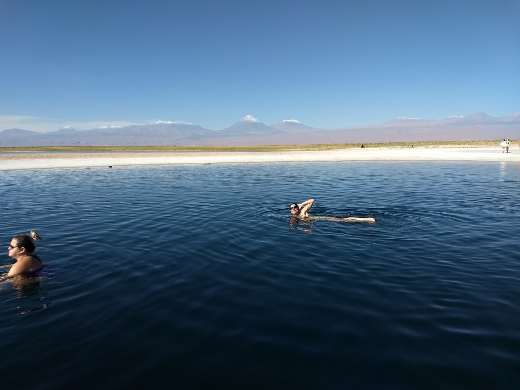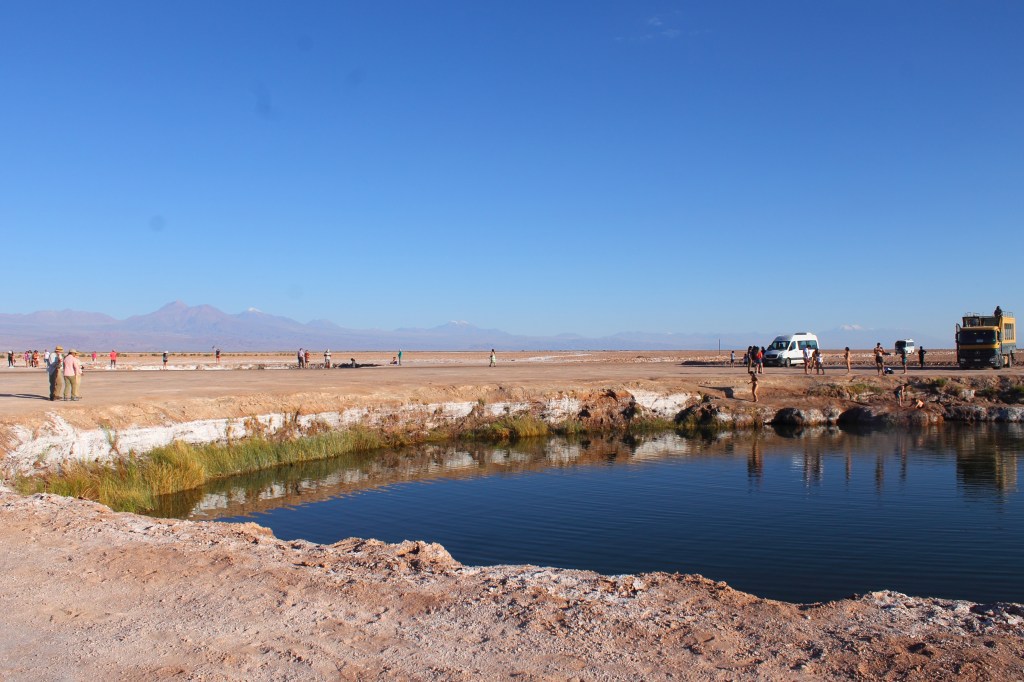 Ponto positivo de ter feito o tour com a Whipala é que ele chega e sai um pouco depois e dos demais tours, o que nos deu 40min sozinhos na lagoa e não pegamos a fila do banho depois. Depois da Laguna Cejar, passamos no Ojos del Salar, em que é possível tomar banho na lagoa ou apenas curtir o Happy Hour oferecido pelo passeio, com drinks e petiscos.