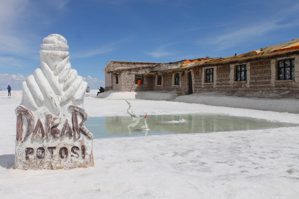 Depois, partimos para o maior deserto de sal de mundo, com 10 mil km2 de sal. Aprendemos um pouco sobre a exploração e processamento do sal no local e depois fomos ao Hotel de sal em meio do deserto. Em março/19, quando fomos, estava tão alagado que a travessia parecia ser em um rio raso.