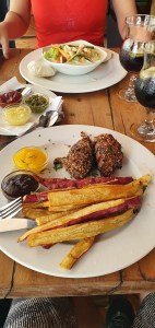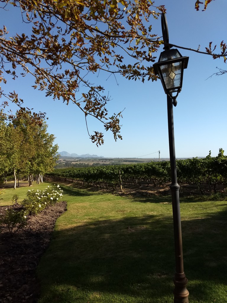 Stellenbosch – Após um delicioso café da manhã no Bay Lodge on The Beach, dirigimos por 4:30 até Stellenbosch. Fizemos check in 13:30 no Apple Tree Guest House. Nosso anfitrião nos deu a dica de almoço no Beyerskloof e foi maravilhoso! Almoço com uma garrafa de vinho e sobremesa com vista para a pequena vinícola deu 540 rands os dois, em torno de 170 reais.