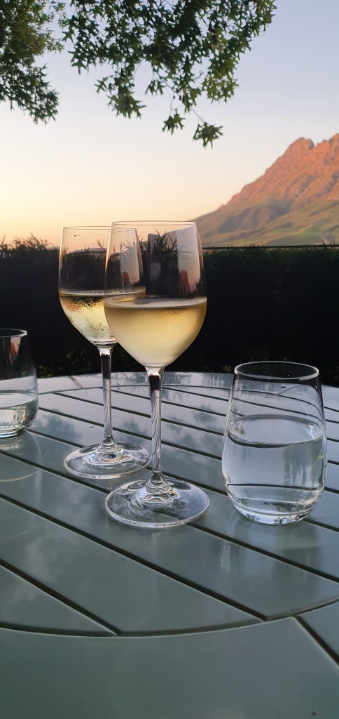 À noite fizemos reserva para jantar na famosa Delaire Graff. É uma das vinícolas mais bonitas e você pode dar uma caminhada no entorno enquanto aguarda o horário da reserva. Aproveitamos a bela vista degustando nosso vinho apreciando o pôr do sol nas montanhas antes de entrar e provar o delicioso jantar deles. O preço é salgado, mas se puder ir, achei tudo delicioso.