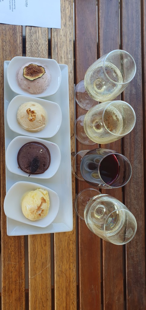 Stellenbosch – Mais vinícolas! Liguei no dia anterior e já fiz minha primeira reserva de degustação: Clos Malverne com a deliciosa combinação de vinho com sorvete. São 4 vinhos harmonizados com 4 sorvetes e vale muito a pena! Os dois juntos combinam lindamente e dão uma explosão de sabores no paladar. Só indo para entender.