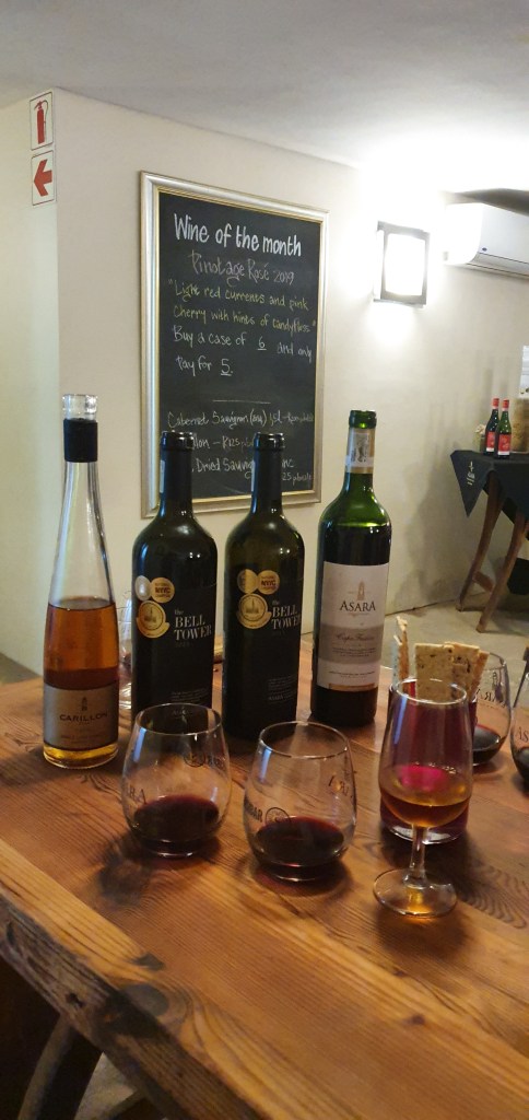 Após a Spier, fomos na Asara para nossa última degustação. Provamos 3 maravilhosos vinhos por – pasmem – 17 reais a degustação dos 3 (e ganhamos uma 4ª taça de brinde). Para efeito de comparação, uma degustação na Bouza, no Uruguai, custa 145 reais. A degustação com vinho e sorvete na Clos foi 128 rands – uns 40 reais.