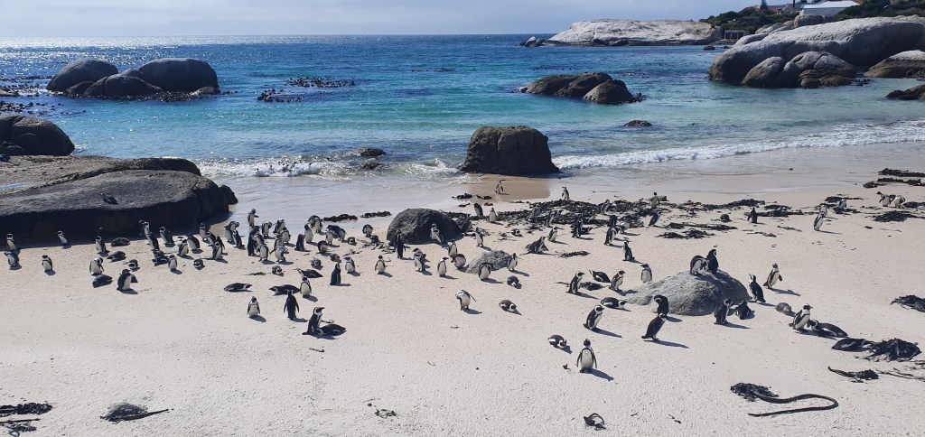 Saímos cedo de Stellenbosch e fomos primeiro na Boulders Beach e Foxy Beach ver os pinguins. A entrada é 160 rands, uns 50 reais. Na Foxy Beach você vê os pinguins de cima da passarela e na Boulders Beach você pode até levar canga e guarda sol e curtir um dia de praia junto aos pinguins soltos ao seu lado. Mas vamos combinar uma coisa: Não toque neles, só observe.