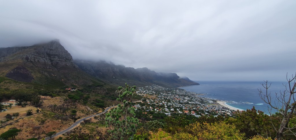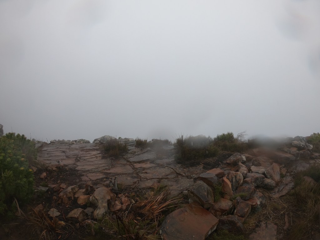 Cape Town – Trilha da Lion’s Head. Perguntamos ao guia do dia anterior sobre a trilha e parecia ser bem tranquila e com uma vista linda da Table Mountain, praias e cidade. Fomos de Uber até o início da trilha e começamos a caminhada já com bastante névoa, que só piorou e começou a chover bem.