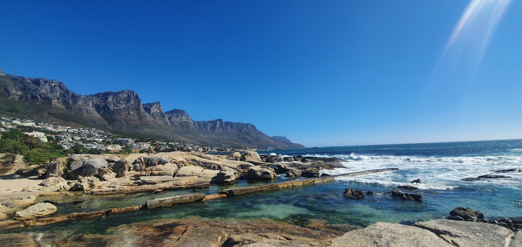 Como estava um dia bem quente, fomos a Camps Bay refrescar na praia e aguardar o pôr do sol. A praia de Camps Bay, ao menos nesse dia, tinha ondas muito fortes e ninguém se arriscou a entrar. Caminhamos um pouco pela orla e descobrimos uma piscina com água do mar na praia (chamam de Camps Bay Tidal Pool). Basicamente eles fazem uma barreira artificial para que o mar fique calmo e você possa mergulhar sem preocupação com as ondas. Achei muito gostoso e era exatamente o que eu procurava para aquela tarde.