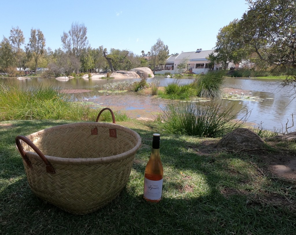 Saindo do Clos, fomos na Spier. Minha intenção sempre foi fazer um piquenique no lago na Spier, mas quando tentei dois dias antes já estava esgotado. Se você também tem vontade de fazer um piquenique, vai adorar essa dica: Mesmo sem reserva, é possível alugar cesta, taças e toalha lá na lojinha deles. Eles possuem diversas opções de pães, frios, bolos, quiches e sanduíches para você colocar na sua cesta e ir comer onde achar mais bonito. E, claro, vinhos geladinhos! Se o gramado não for sua praia, também tem mesas de piquenique espalhadas pela vinícola. Além do piquenique, a propriedade é bem grande e tinha trilhas de 10km lá dentro. Nós fizemos uma pelo rio bem curtinha e é bem bonita.