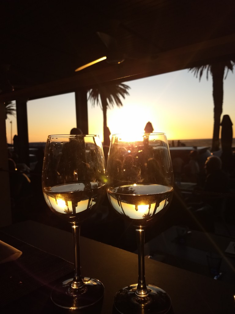 Ao fim do dia, com o vento forte e frio nós procuramos abrigo em um dos bares para apreciar o pôr do sol. Nossa escolha foi o Mantra Café, mas só recomendo para tomar um vinho enquanto aprecia a paisagem, pois a comida era cara e não muito saborosa.