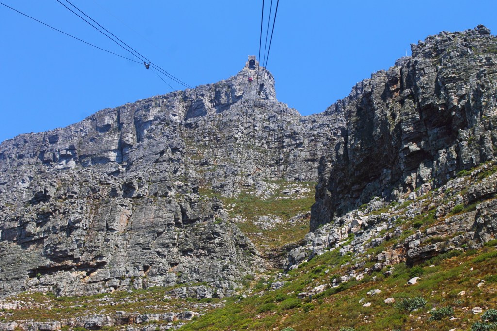 Cape Town – Aproveitamos o dia de sol sem nuvens para conhecer a Table Mountain. Paguei antecipado o Cable Car para subir e descer, mas é uma fila tão grande que talvez valha a pena pelo menos descer de trilha. Foi 1h e 30 de fila e, ao subir, aproveitamos para fazer o tour gratuito oferecido.