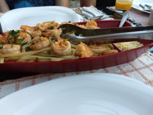 Ambiente muito gostoso para almoço e comida deliciosa. O atendimento também é ótimo. Comemos em 5 pessoas a massa com camarão e um prato de peixe com banana + bebidas e a conta deu 255 reais.