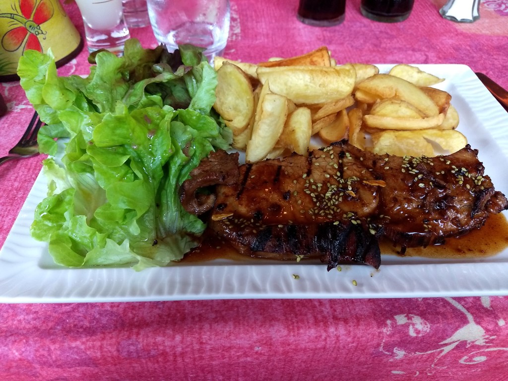 Le Relais (Moustiers St Marie) – Era o único restaurante aberto (tudo fecha cedo em todas as cidades desse roteiro, fiquem atentos), mas era muito bom. O especial do dia era um filé suíno com salada e batata frita.